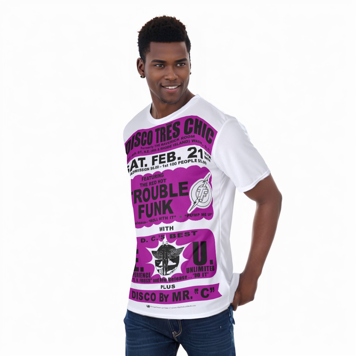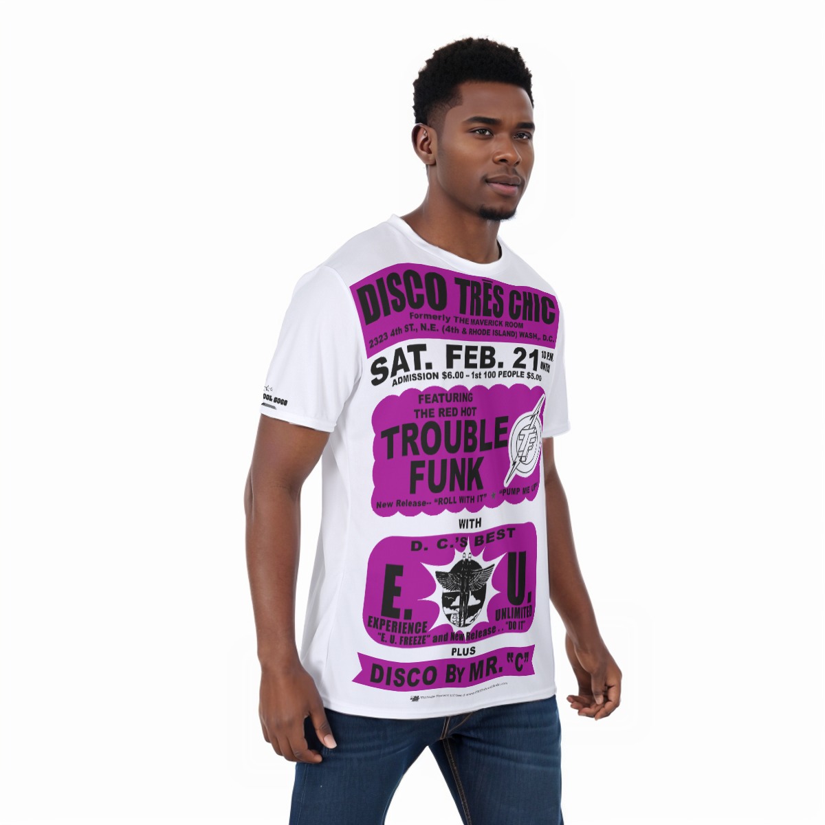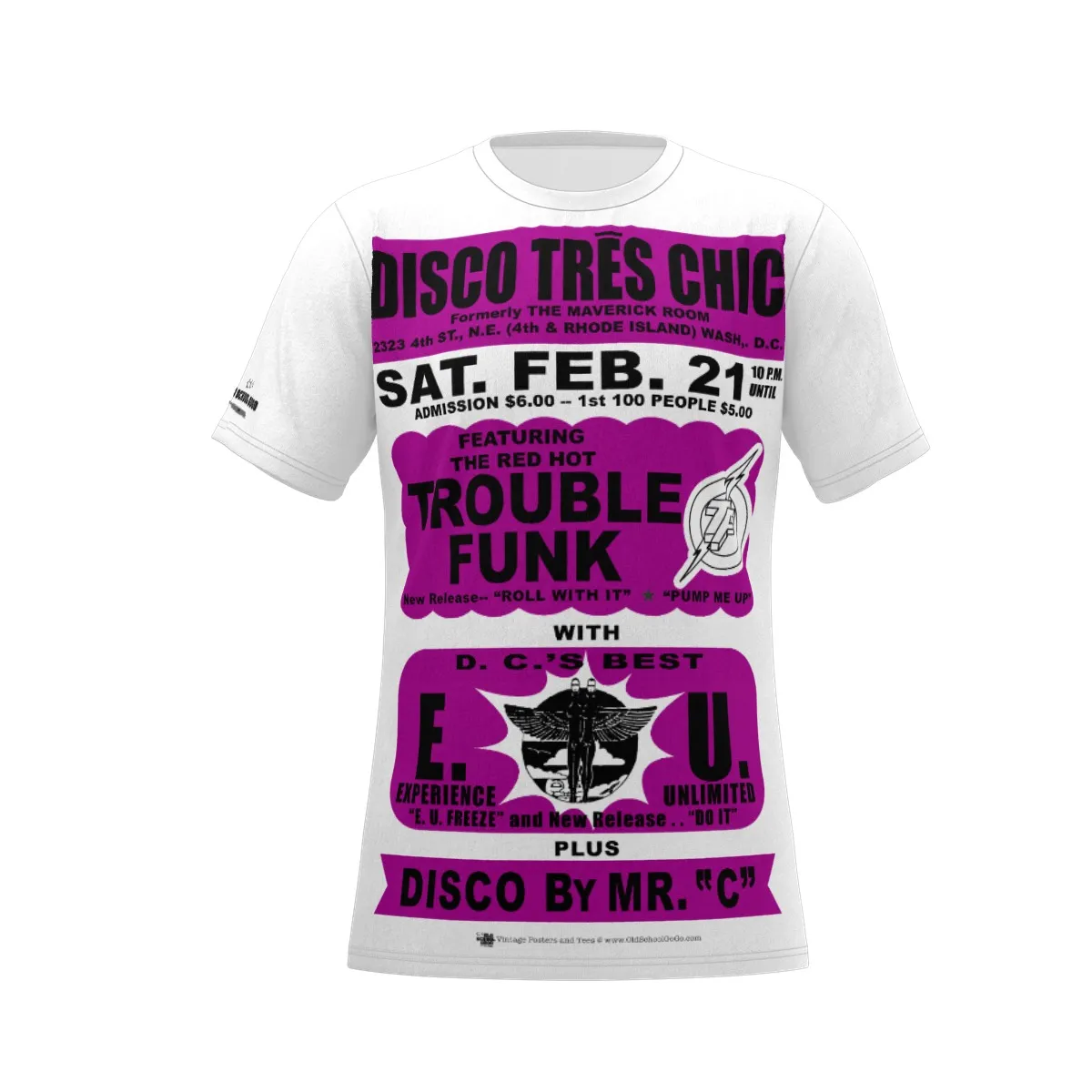 *Tee – Full Print – Disco Tres Chic – Trouble Funk & EU – Wine Print on White