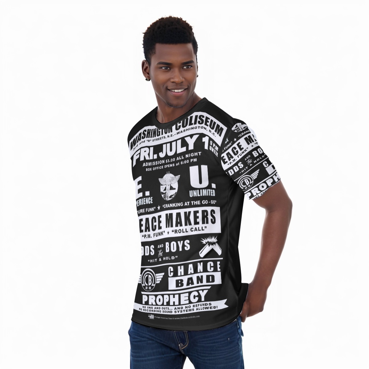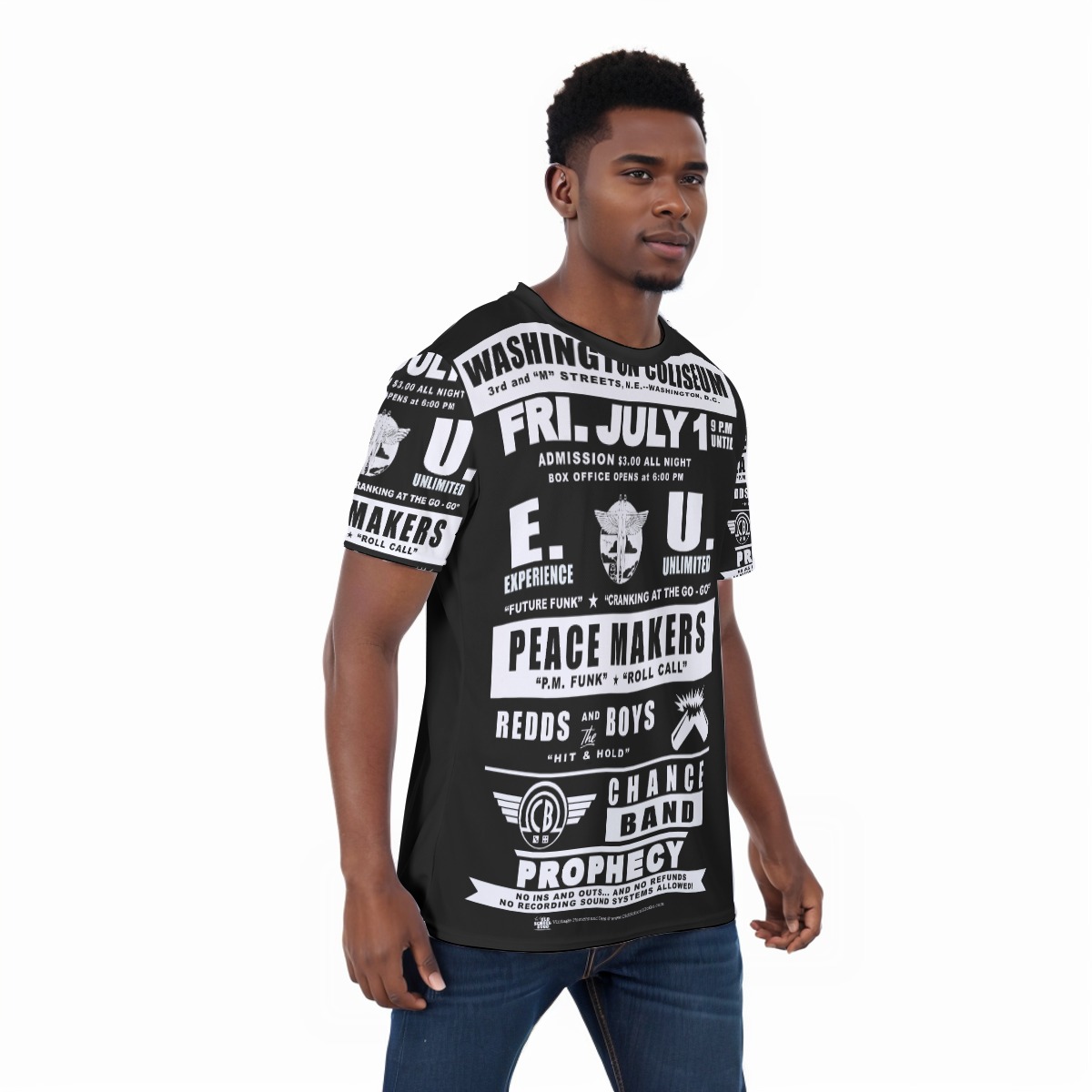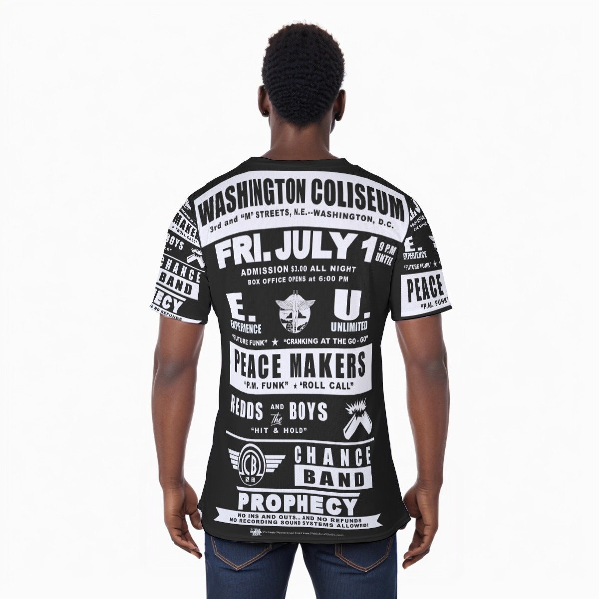 *Tee – All Over Print (Front & Back) – Coliseum – EU, PeaceMakers, Redds & The Boys, Chance & Prophecy – White on Black