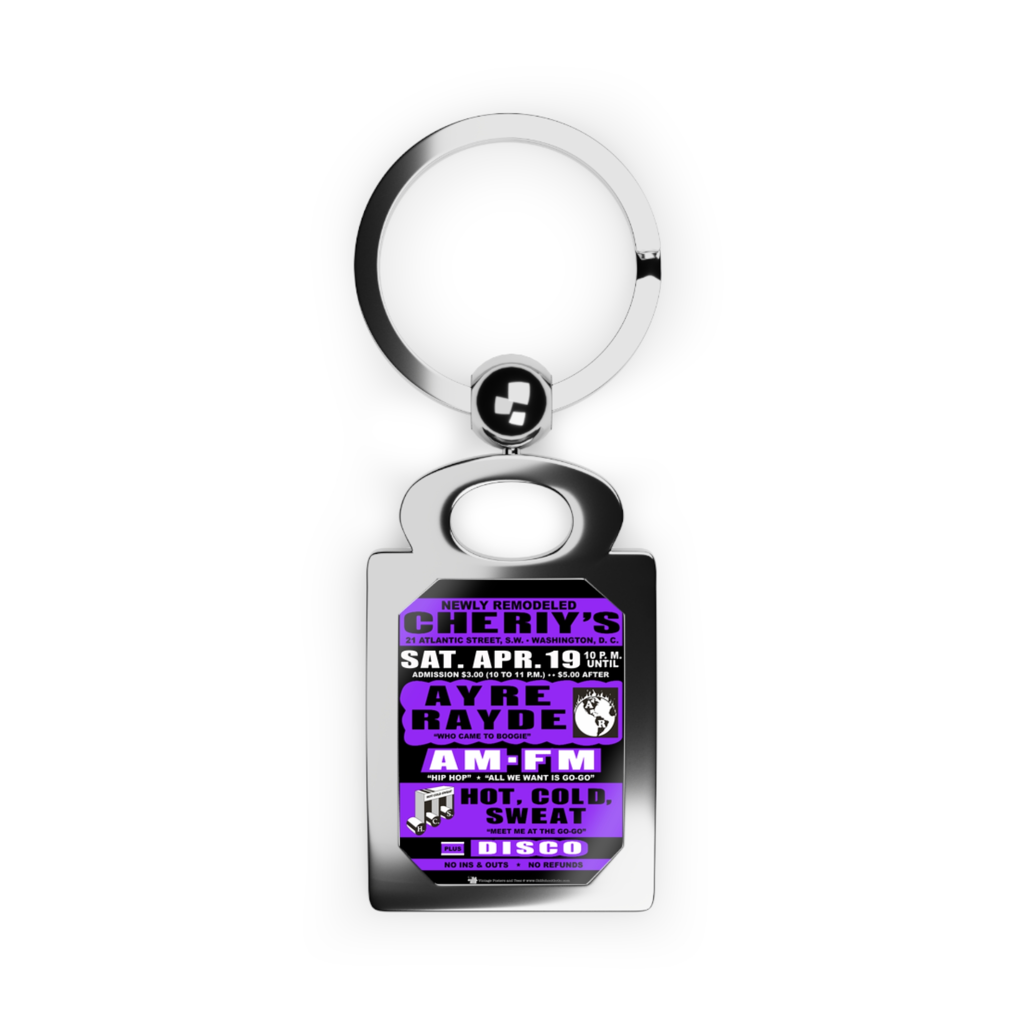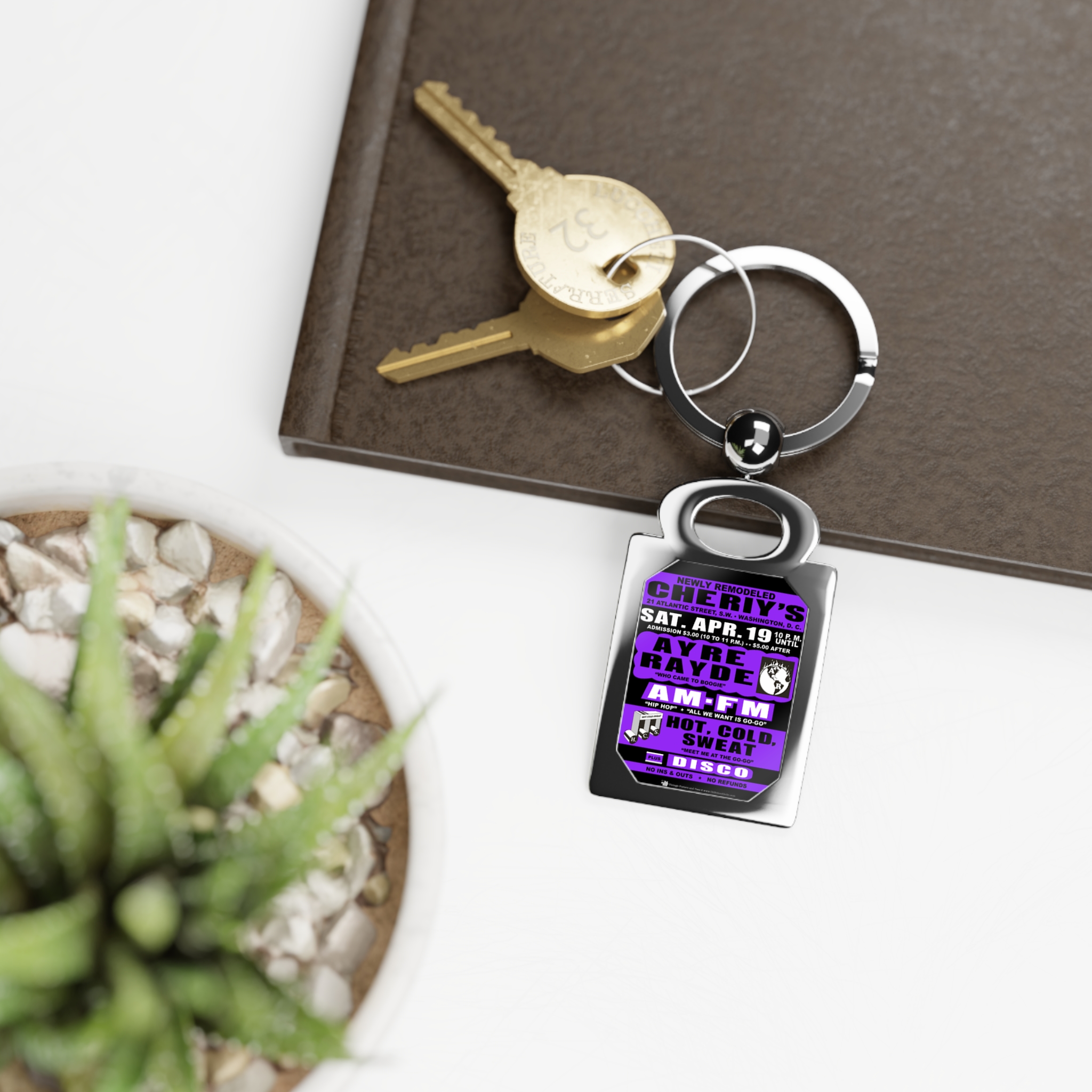 Be the first to review “Keyring – Cheriy’s – Ayre Rayde, AM-FM & Hot, Cold, Sweat – Electric Purple w/Black Background”