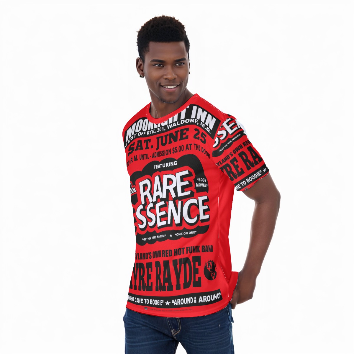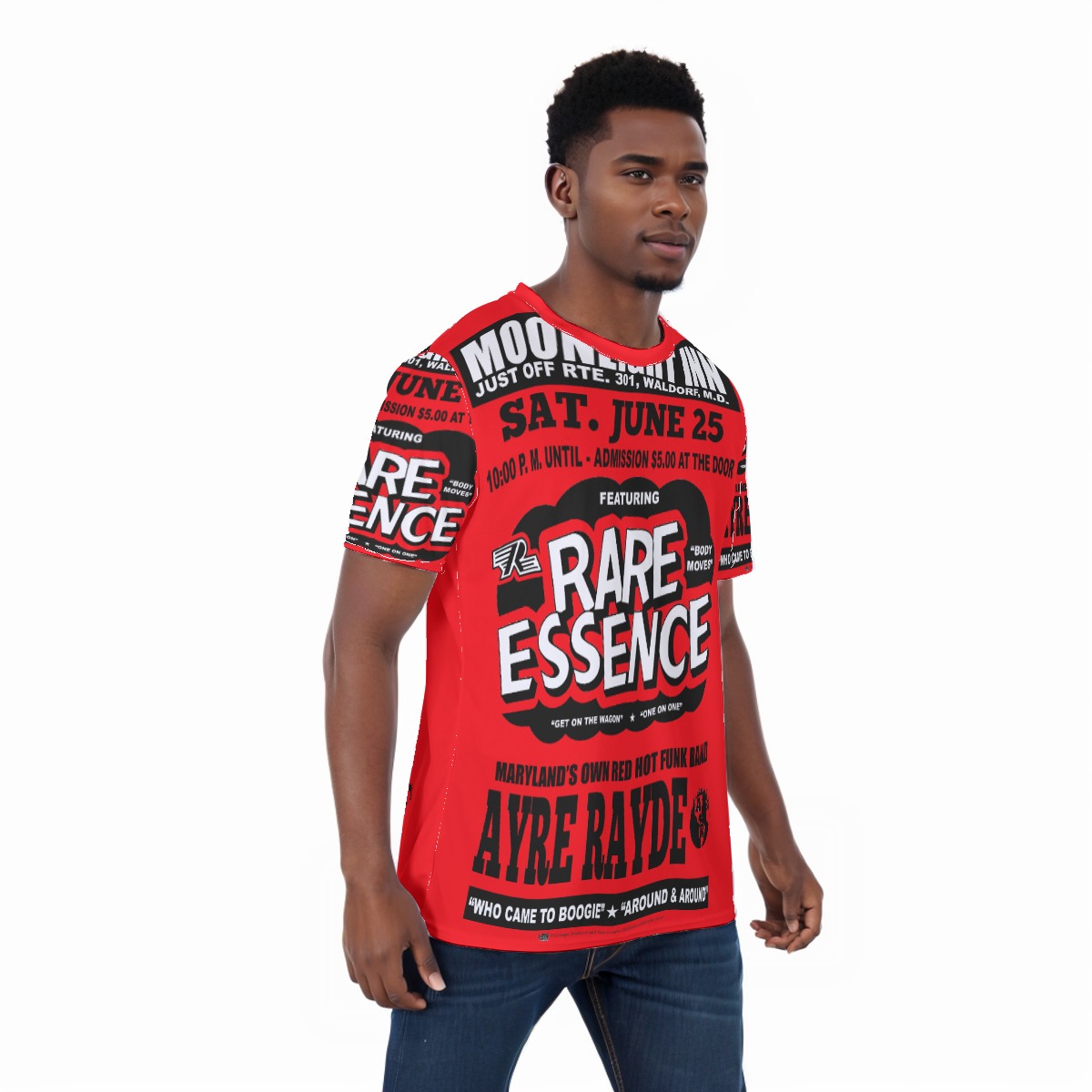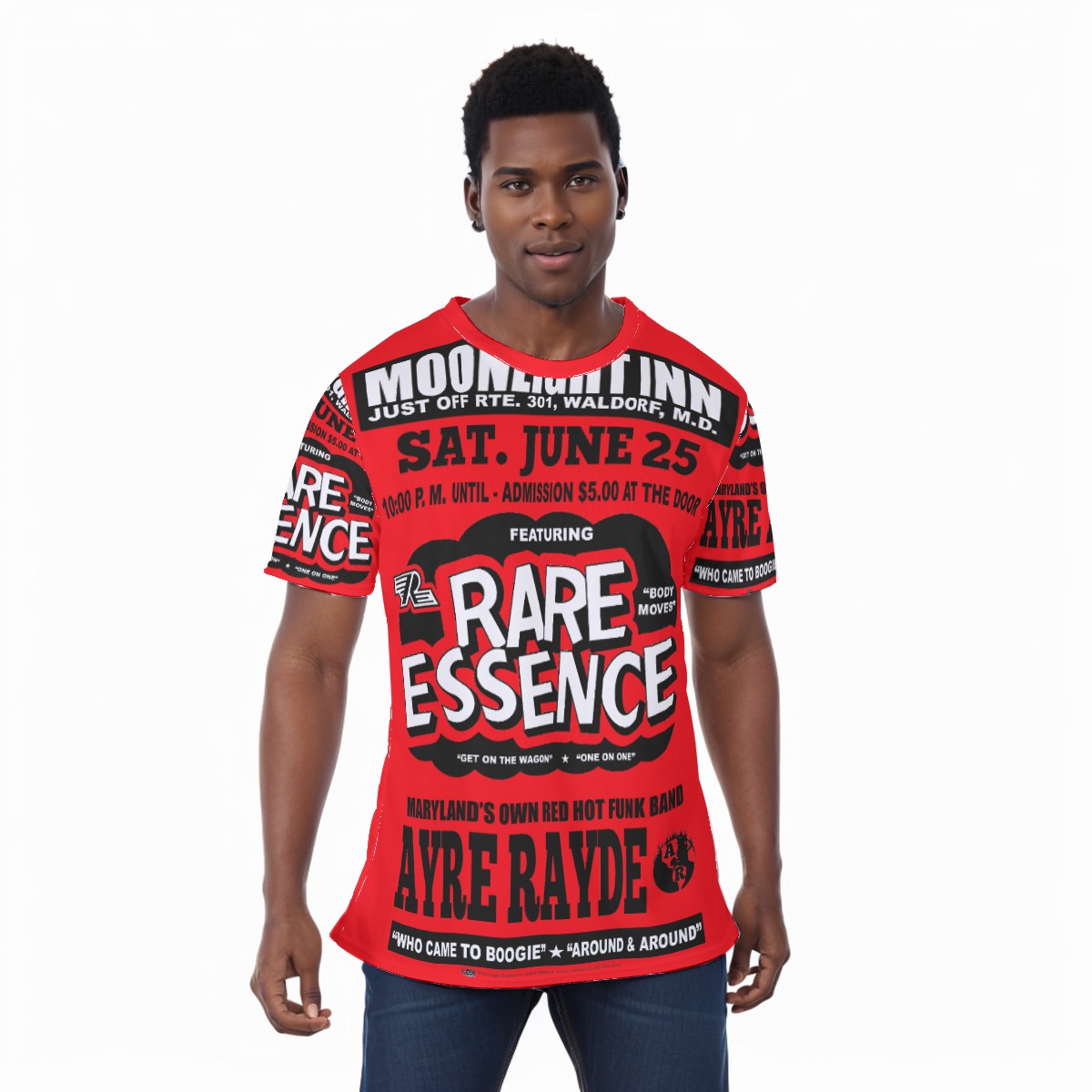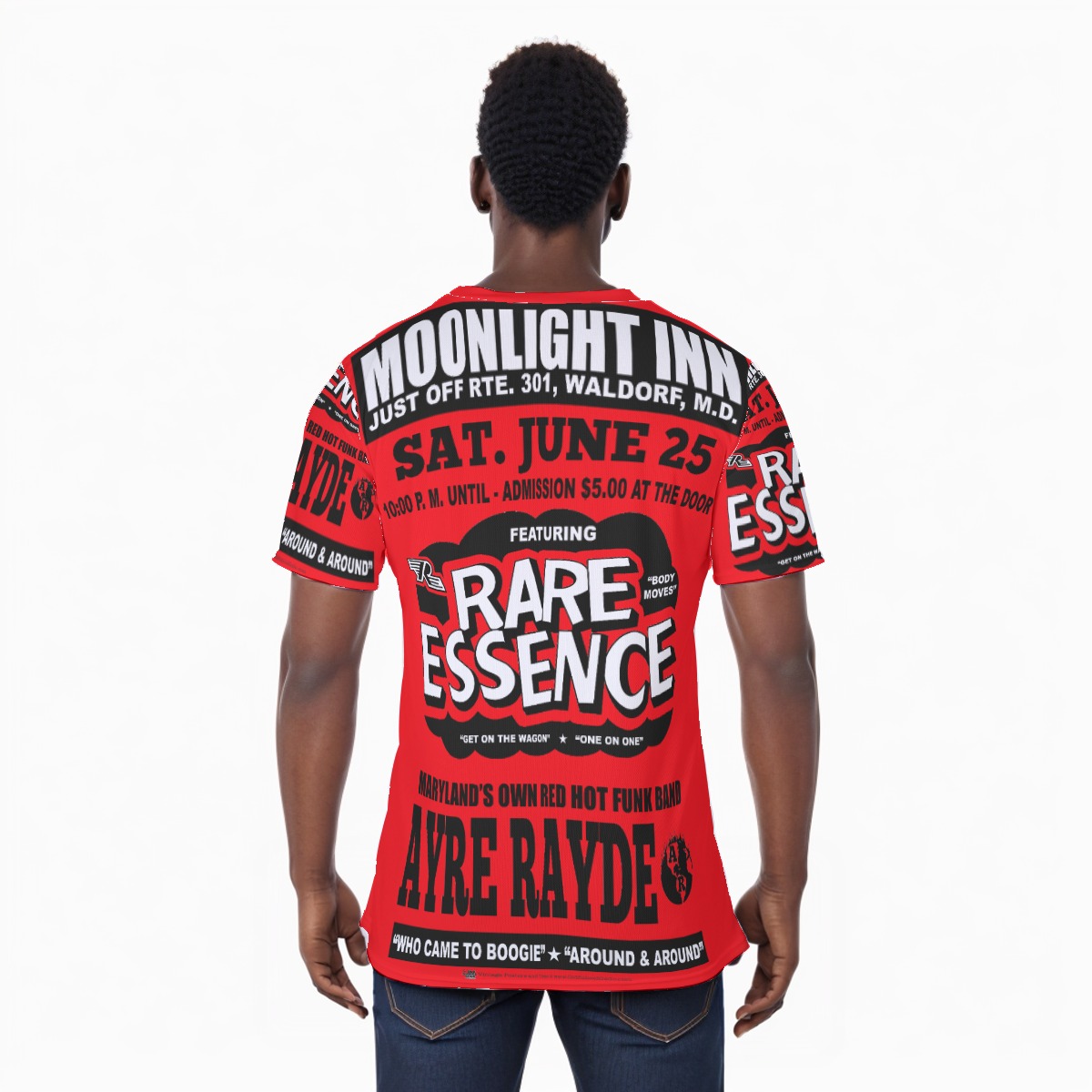 *Tee – All Over Print (Front & Back) – Moonlight Inn – Rare Essence & Ayre Rayde – Black on Red