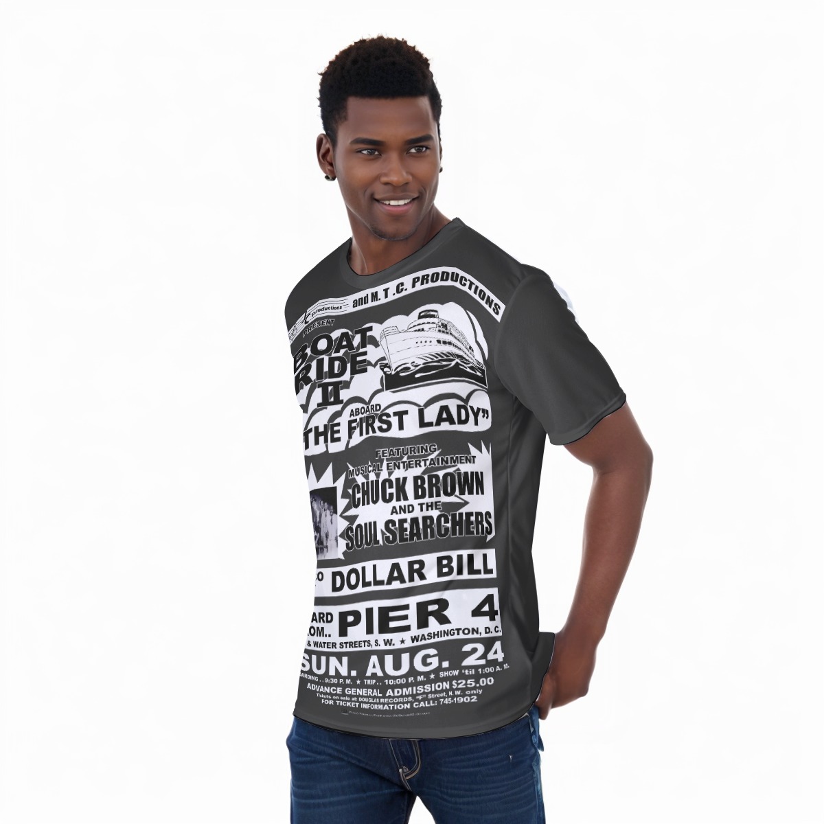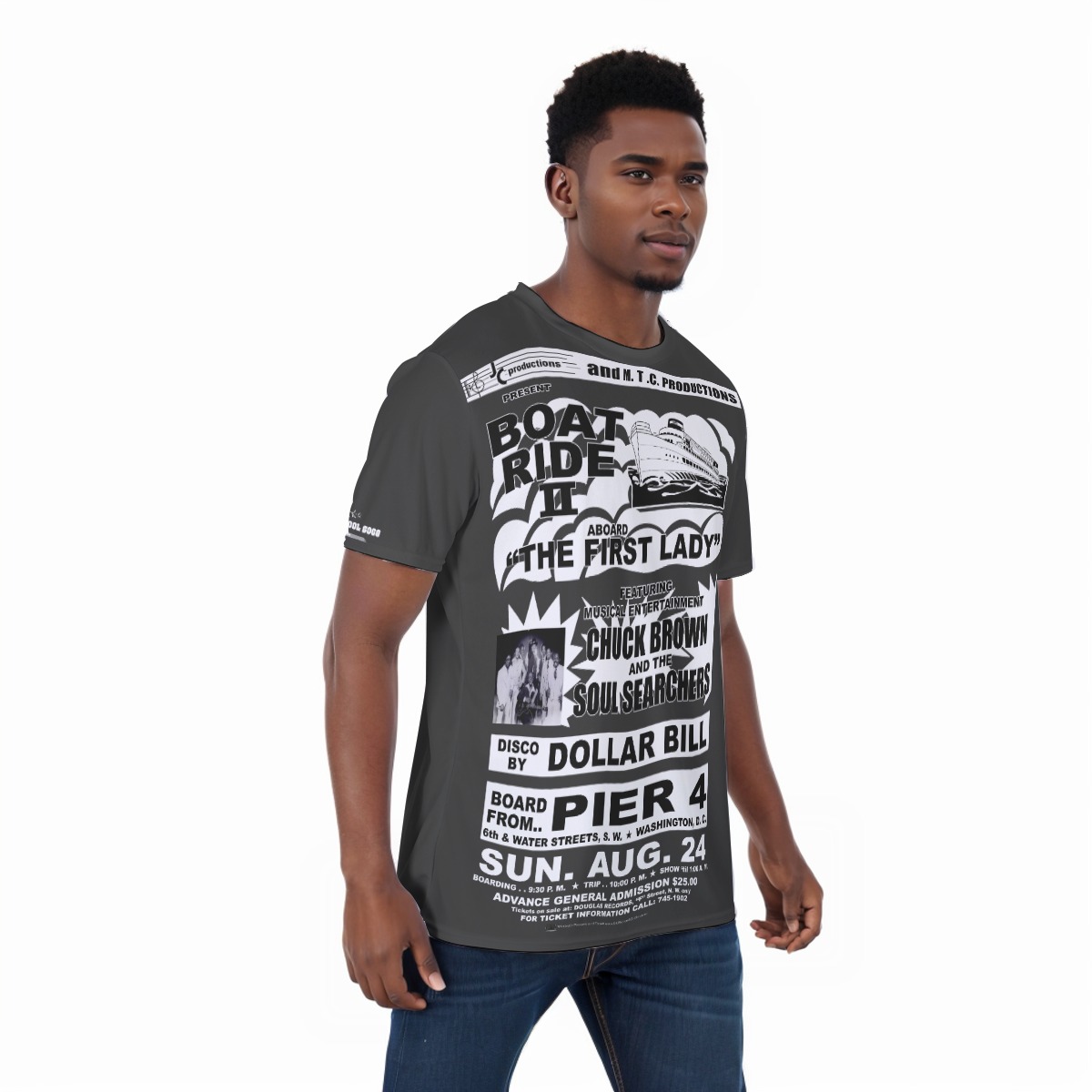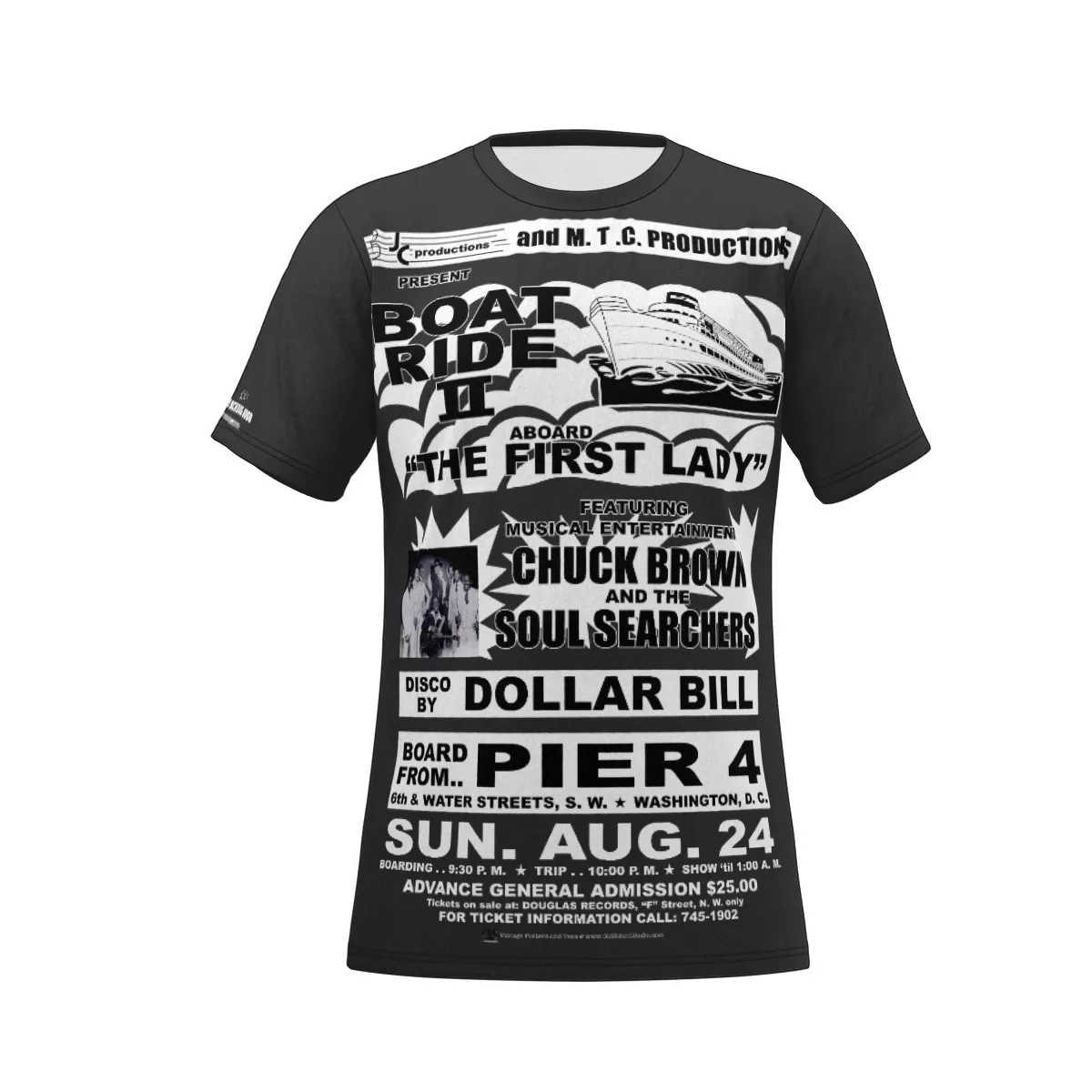 **Tee – Full Print – Boat Ride – Chuck Brown & The Soul Searchers – Black & White on Dark Grey
