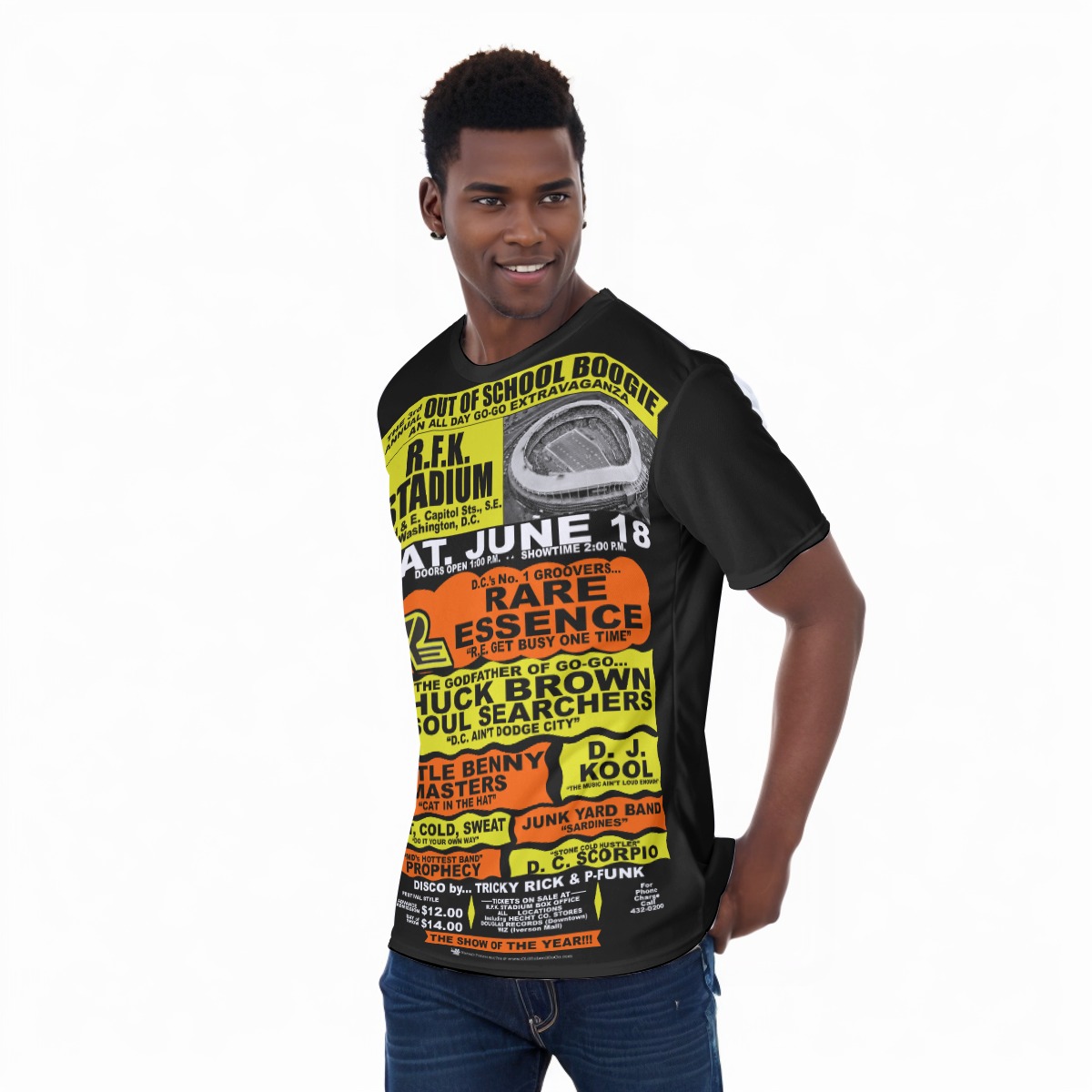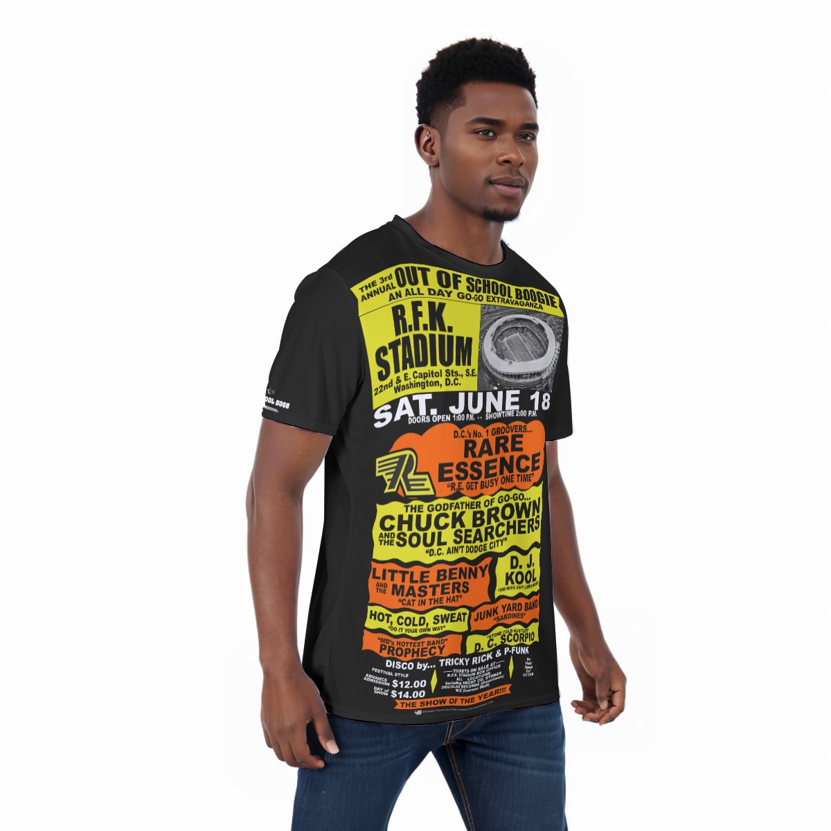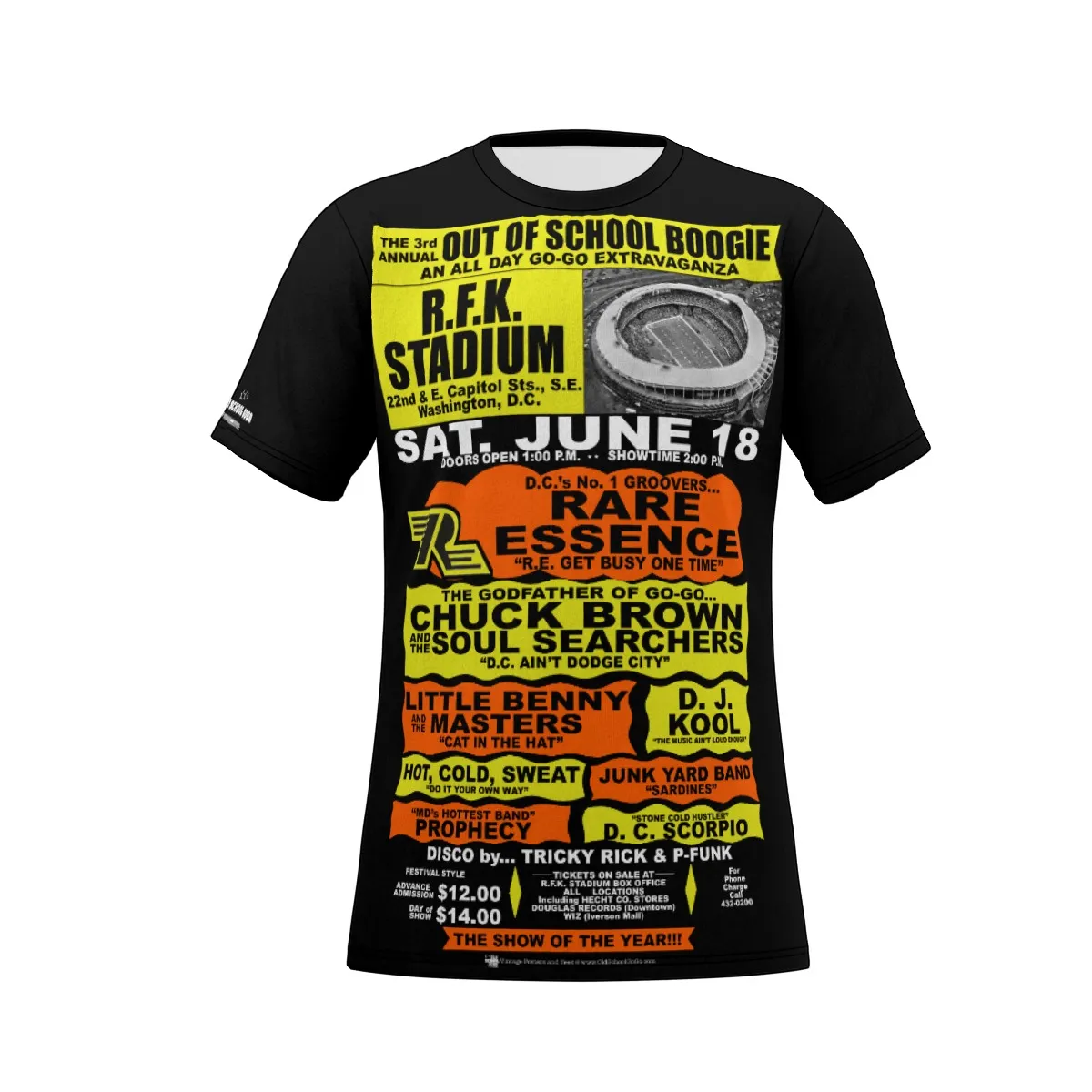 *Tee – Full Print – RFK Stadium – RE, Chuck, Benny, Junk, Hot Cold Sweat, Prophecy – Orange & Yellow on Black